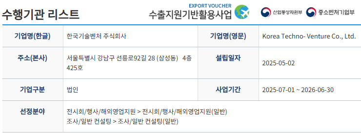 한국기술벤처주식회사는 수출바우처사업 수행기관으로서, 조사/일반컨설팅, 전시회/행사/해외영업지원 서비스를 수행하고 있습니다. 일본을 중심으로 아시아지역을 서비스 대상 지역으로 하고 있습니다. [조회]