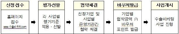 ○ 수출 유망한 중소기업을 선정하여 바우처를 부여, 선정기업이 서비스를 공급하는 수행기관 등을 통해 자유롭게 수출지원 서비스를 이용 후 소요비용 정산